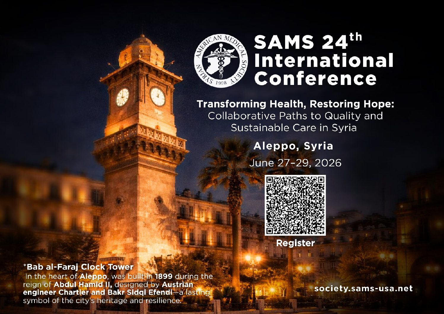 Get ready for an unforgettable experience at the SAMS 24th International Conference, taking place June 27-29, 2026 in Aleppo, Syria. This is more than just a conference; it’s an opportunity to be part of a movement that will reshape the future of healthcare in Syria.